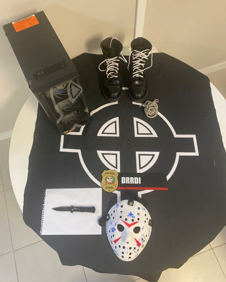 Durante as diligências, foram apreendidos objetos, símbolos nazistas e equipamentos eletrônicos, que serão devidamente periciados e analisados, com a finalidade de elucidar totalmente o caso e identificar eventual participação de outros envolvidos.