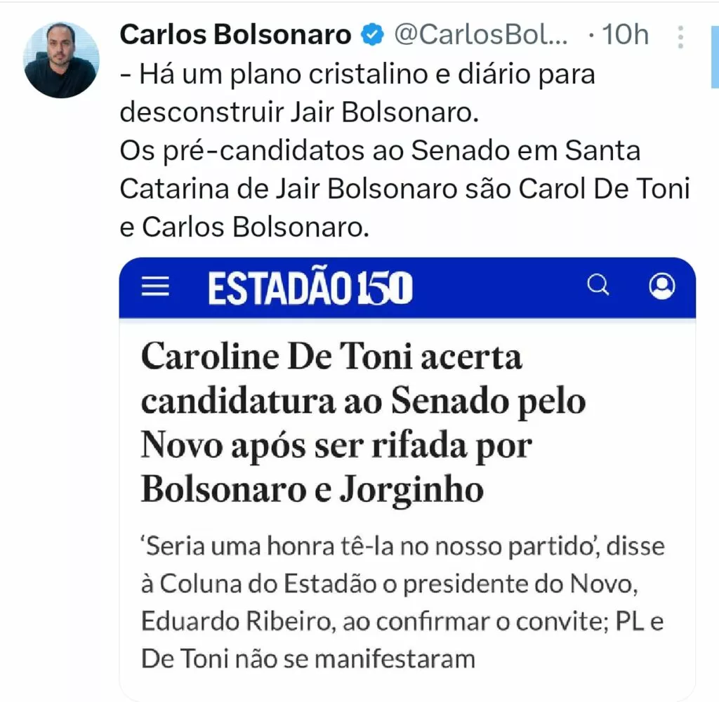 O vereador do Rio de Janeiro, Carlos Bolsonaro (PL), e o deputado federal Eduardo Bolsonaro (PL), ao rebaterem uma informação de que a deputada federal Carol de Toni (PL) se filiou ao Novo para disputar uma vaga ao Senado, afirmaram categoricamente que os candidatos ao Senado por Santa Catarina apoiados pelo ex-presidente Jair Bolsonaro (PL) são o próprio Carlos e Carol de Toni (PL).
