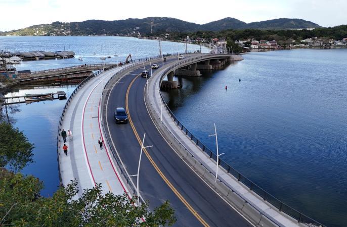 Ciclistas e pedestres já podem usar as estruturas da nova ponte da Lagoa da Conceição construídas especialmente para eles. É que a passagem pela ciclovia e pelos dois passeios foi liberada pela Prefeitura de Florianópolis no final da manhã desta sexta-feira (26). Com isso, para a conclusão total da obra dessa que é a maior travessia da Ilha ficará faltando apenas a retirada do escoramento de madeira, em sua parte inferior, o que deve levar cerca de duas semanas. As obras estão sendo conduzidas pela Secretaria de Infraestrutura e Manutenção da Cidade.
