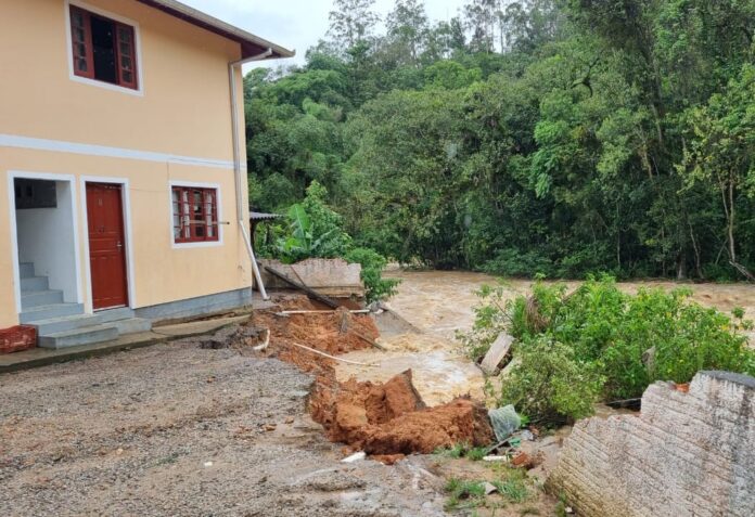 A Defesa Civil de São José interditou na manhã desta terça-feira (9) um prédio de quatro quitinetes localizado às margens do Rio Maruim, no km 8,5 da SC-281, no bairro Colônia Santana, depois que um muro cedeu durante a forte chuva que atingiu a região. O volume de chuva registrado chegou a 80,2 milímetros em apenas três horas, provocando erosão no terreno e comprometendo a estrutura do imóvel.