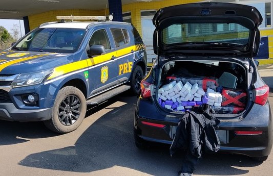 O veículo, ocupado por dois homens, foi abordado e, durante a vistoria, os policiais encontraram diversos tabletes da droga. A maconha estava escondida no porta-malas e sob os bancos do carro.