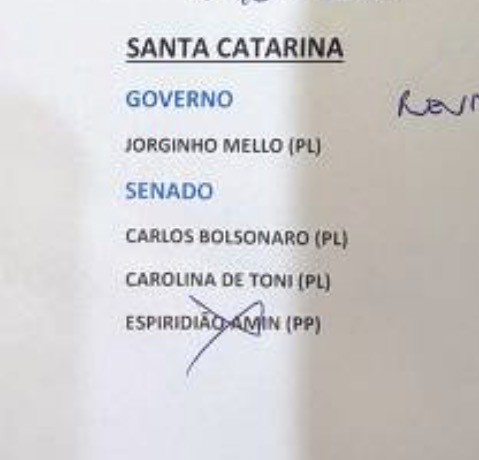 Por sua vez, Esperidião Amin não tem atenuantes. Também marcada a caneta na fatia catarinense do mapa estratégico de Flávio Bolsonaro, constava uma “reunião quarta à tarde”. Era o esperado encontro que definiria a chapa Carol/Carol e precederia a manifestação pública de Flávio a essa composição. Foram duas entrevistas. Na primeira, o presidenciável confirmou Caroline de Toni ao lado de Carlos Bolsonaro e fez elogios a Amin, inclusive relevando que conversaram sobre o assunto no plenário do Senado.