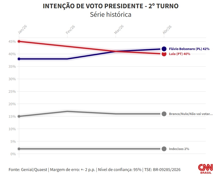 O resultado representa um empate dentro da margem de erro, de 2 pontos percentuais, para mais ou para menos. Na pesquisa anterior, divulgada em março, Flávio e Lula empatavam em 41% (veja detalhes no gráfico abaixo).