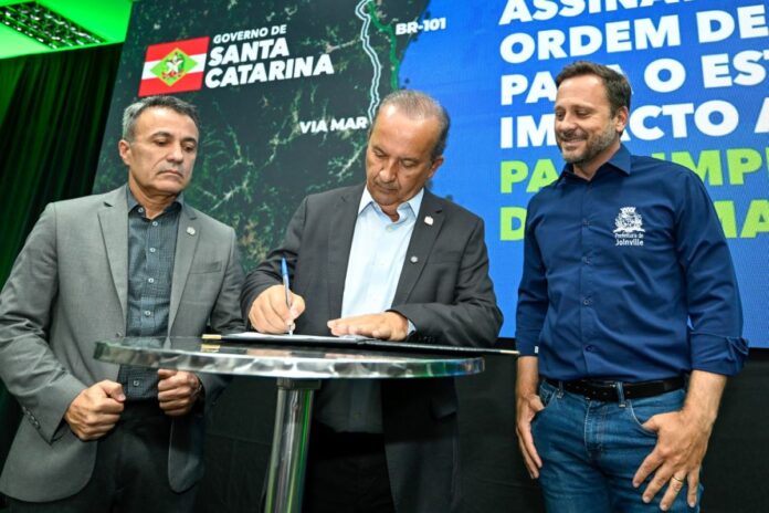 O governador Jorginho Mello (PL) assinou, nesta segunda-feira (24), em Joinville, a ordem de serviço para o Estudo de Impacto Ambiental (EIA/RIMA) da obra da Via Mar, o corredor alternativo à BR-101 que ligará Joinville a Biguaçu.