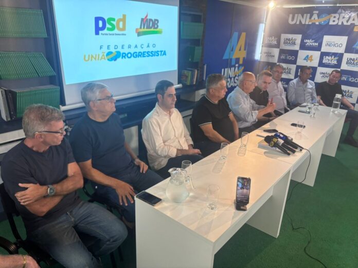 A coletiva de imprensa foi realizada na sede do União Brasil e marcou a formalização da intenção de composição entre PSD, MDB e a federação União Progressista. O acordo é para que o MDB indique o candidato a vice-governador, enquanto o senador Esperidião Amin será o nome para o Senado.