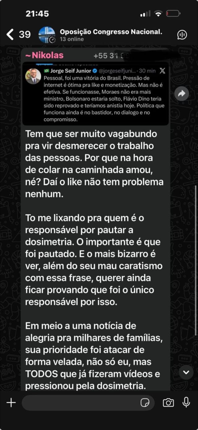 O deputado federal de Minas Gerais, Nikolas Ferreira (PL), não gostou de uma manifestação do senador catarinense Jorge Seif Júnior (PL) em um grupo de WhatsApp da oposição em Brasília. Seif, ao escrever sobre a votação do veto do presidente Lula (PT) ao projeto da Dosimetria, fez uma crítica às pressões na internet, as quais definiu serem boas para likes e monetização, mas ressaltou que o que funciona é diálogo e compromisso.