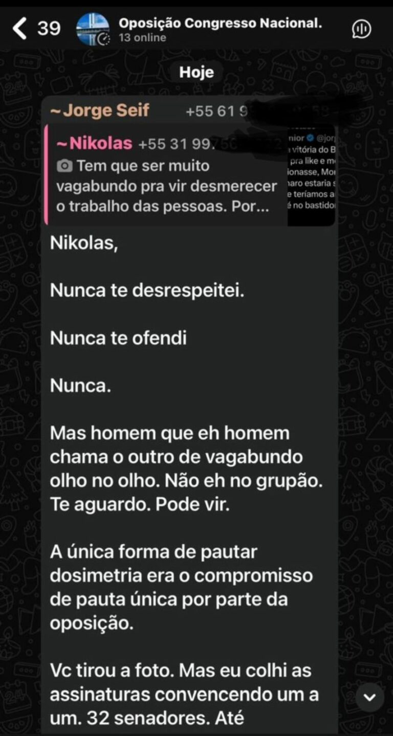 A postagem irritou Ferreira, que xingou Seif de vagabundo, criticando a sua tentativa de atrair os holofotes. Seif respondeu, intimando Nikolas a falar “olho no olho”, e provocou: “Vc tirou a foto. Mas eu colhi as assinaturas, convencendo um a um: 32 senadores. Até”. A coluna teve acesso aos diálogos: