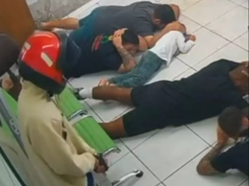 Imagens de câmeras de segurança mostram o momento em que as pessoas são colocadas no chão e os assaltantes circulam pelo ambiente recolhendo valores e exigindo as transferências bancárias.