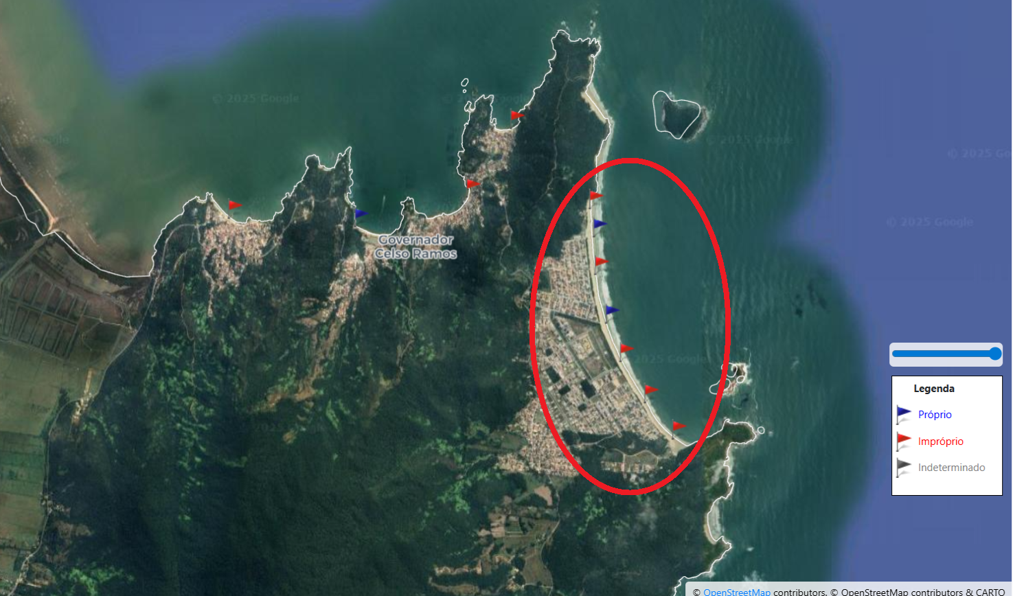 A Praia de Palmas, em Governador Celso Ramos, está com cinco pontos impróprios para banhos, dos sete analisados pelo Instituto de Meio Ambiente (IMA) de Santa Catarina. Isso representa 71,41% dos locais monitorados. Os dados são referentes ao relatório de balneabilidade divulgado na véspera do Ano Novo.