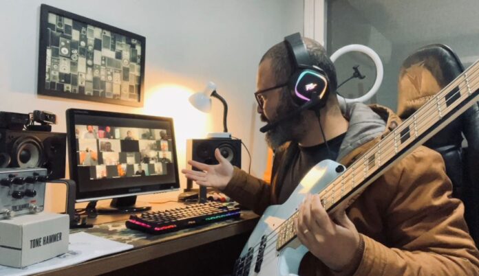 Para ministrar as aluas, Denis usa o Zoom e o Youtube para se conectar com os alunos. O curso é totalmente online, com mentorias em grupo, que é feita toda semana. “Tem vários tipos de pessoas nessas mentorias em grupos, pessoas com idade mais avançada e idade bem jovem“, diz o baixista.
