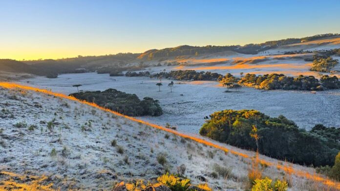O Instituto Nacional de Meteorologia (Inmet) emitiu alerta laranja de onda de frio em praticamente todo o estado do Rio Grande do Sul e no oeste de Santa Catarina até as 10h desta sexta-feira (27).
