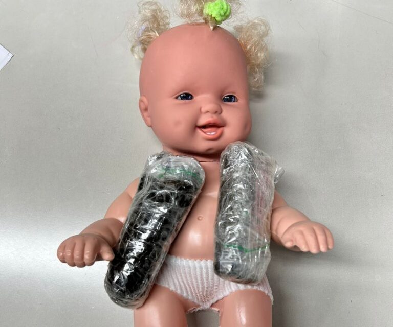 Durante a inspeção, foi confirmado que o interior da boneca estava recheado com haxixe, evidenciando um método de ocultação sofisticado. Em diligências complementares realizadas no mesmo contexto operacional, com apoio da Coordenadoria de Operações com Cães da PCSC, também foram localizadas porções de cocaína e skunk em outras encomendas.