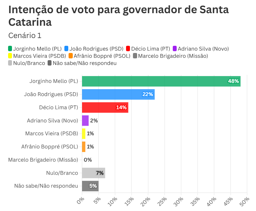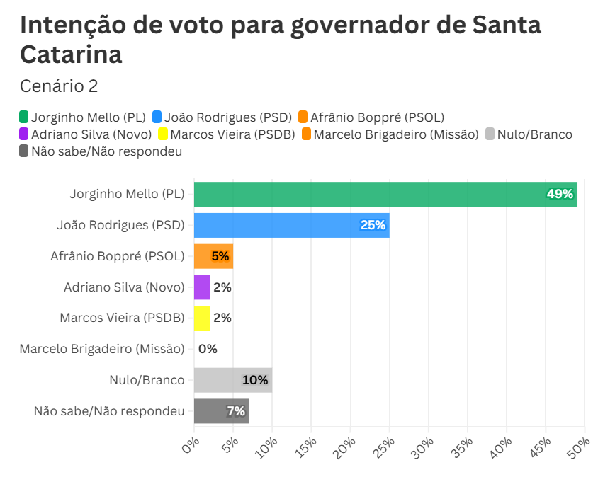 Jorginho supera com folga seus principais adversários, entre eles o prefeito de Chapecó, João Rodrigues (PSD), o presidente do Sebrae, Décio Lima (PT), e o prefeito de Joinville, Adriano Silva (Novo).