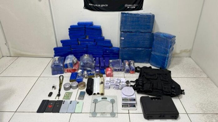 No imóvel, os policiais encontraram mais entorpecentes, totalizando cerca de 120 quilos de maconha armazenados na residência e no veículo Tiguan. Também foram apreendidas quatro balanças de precisão, materiais utilizados para fracionamento e embalagem da droga, adesivos indicativos de comercialização, cinco aparelhos celulares, uma placa balística, uma capa de colete balístico e uma case para pistola.