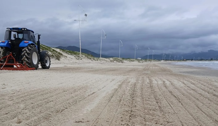 Na ultima semana foi realizada uma importante ação de limpeza nas praias. Através da utilizam de um o trator equipado com o ancinho, além da remoção de resíduos e detritos, é possível também efetuar o nivelamento da faixa de areia, permitindo a todos um passeio mais seguro.