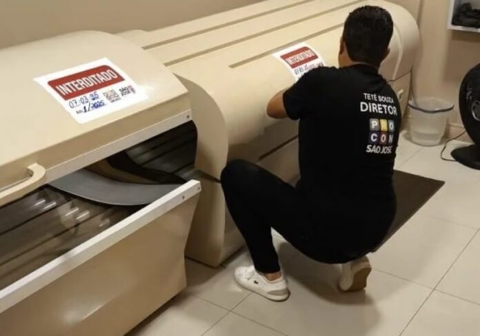 O Procon de São José interditou, na manhã desta sexta-feira (7), dois equipamentos de bronzeamento com luz ultravioleta, que são proibidos pela Agência Nacional de Vigilância Sanitária (Anvisa), numa clínica de estética. O estabelecimento foi notificado por também ter descumprindo interdição anterior do órgão, emitida em dezembro de 2024.