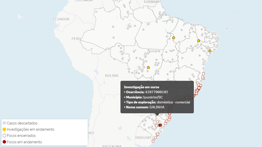 Um caso suspeito de gripe aviária na produção comercial é investigado em Ipumirim, no Oeste de Santa Catarina. A informação consta do mapa do Ministério da Agricultura e Pecuária, atualizado diariamente, e foi confirmada pelo município nesta segunda-feira (19). No total, são dois casos confirmados e seis sob investigação em todo o país. Veja abaixo: