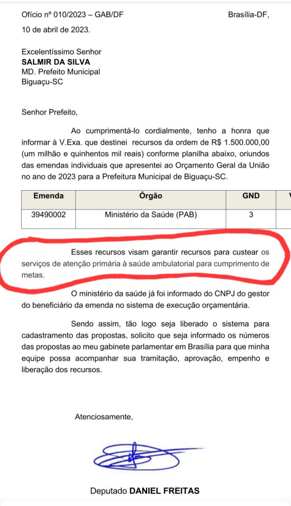Ocorre que a informação de Bia Borba é falsa. Na verdade, os recursos destinados pelo deputado foram para o custeio da atenção primária à saúde ambulatorial, conforme o ofício do deputado enviado à Prefeitura de Biguaçu na época (veja o print abaixo).